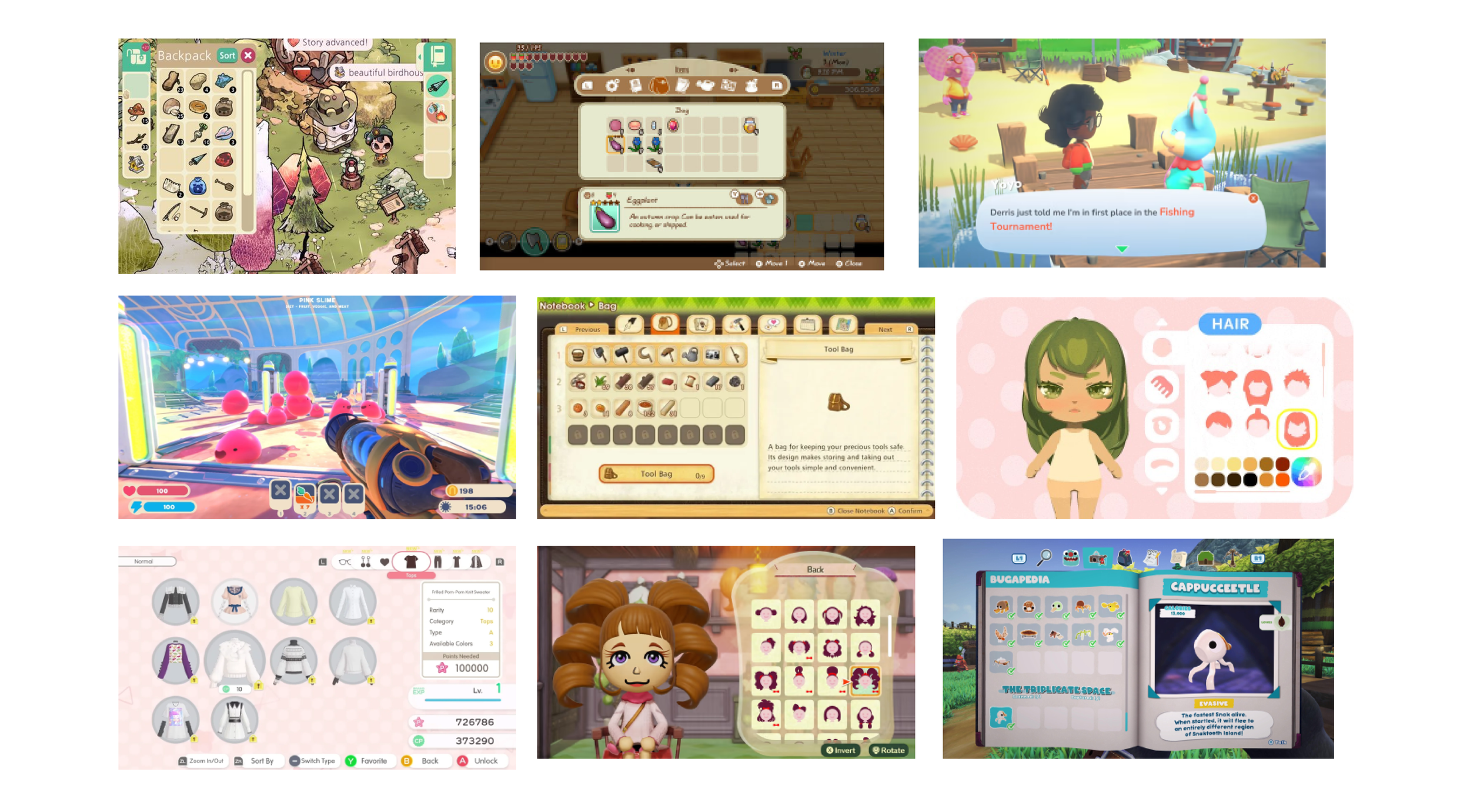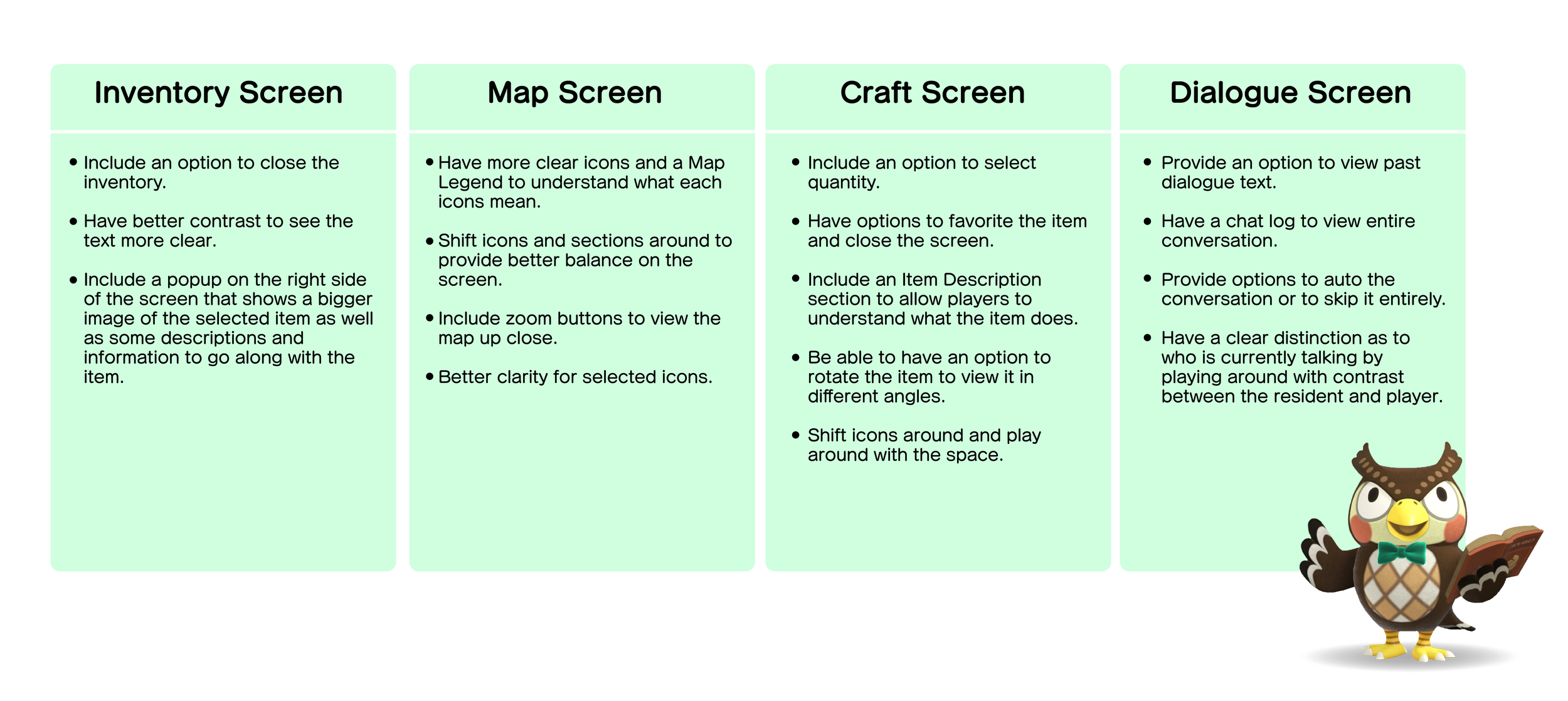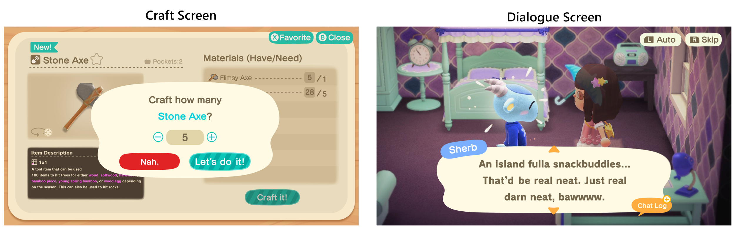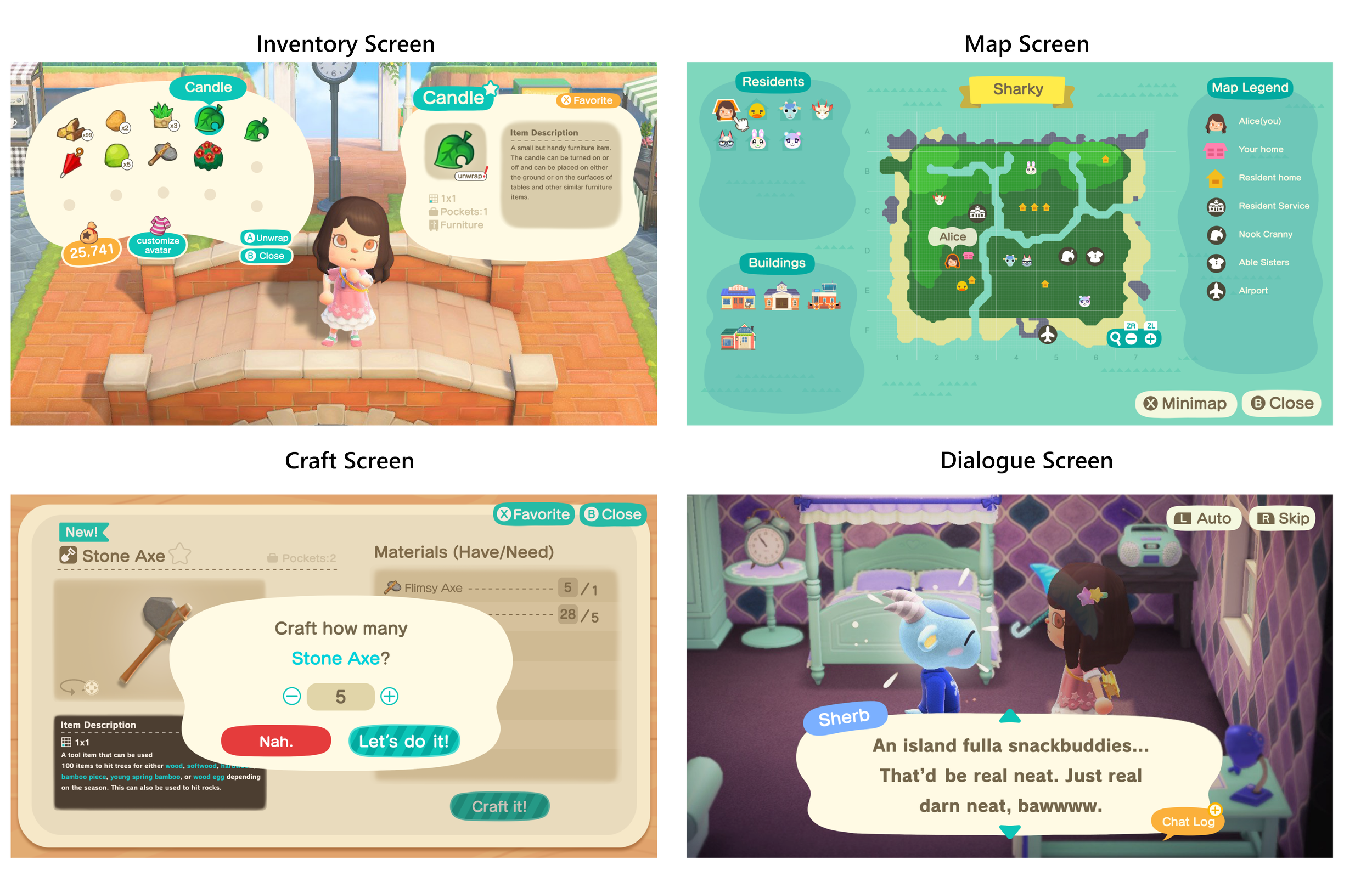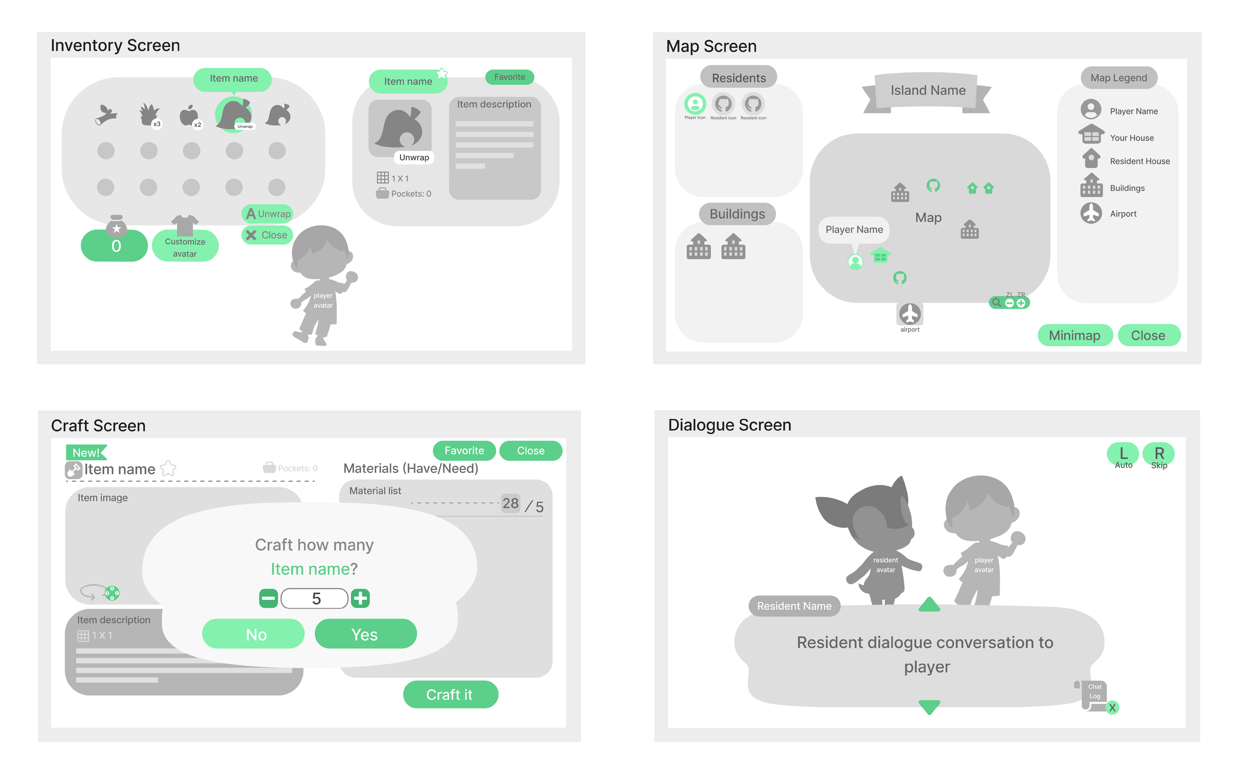 Looking closely at the art and style of Animal Crossing: New Horizons, I wanted to keep the consistency on-theme with how the interface is in the game. The shapes are very simple and rounded, with limited sharp edges as well as minimal to no shading or depth in the interface. I compiled a mood board and UI style guide of similar interfaces as seen in other games that showcases the simple and graphic look of the UI.