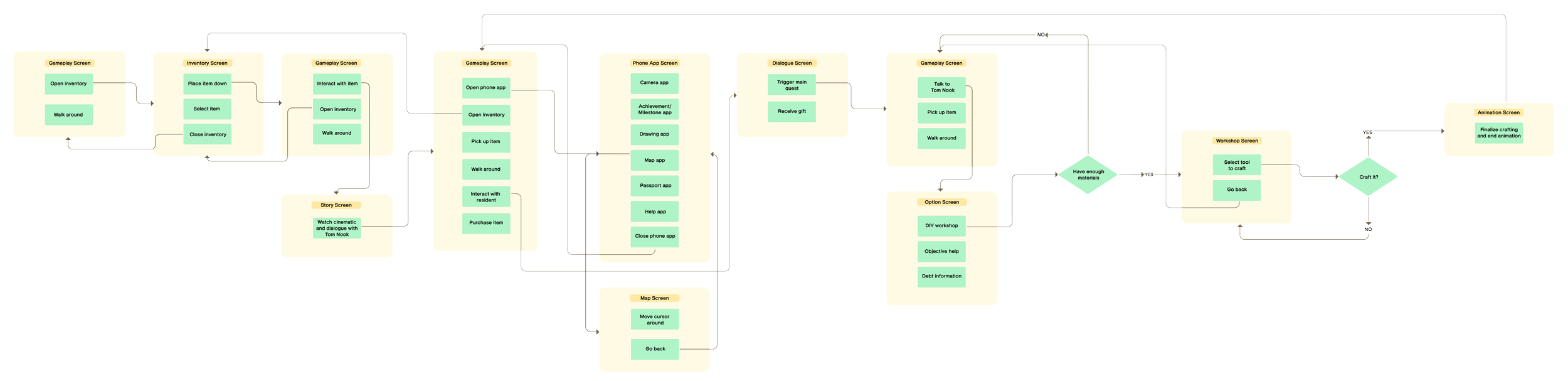 The Flow Chart diagram below was created to map out the user journey within the game experience. It visually outlines the steps the players take through first opening their inventory, navigating around the map, and eventually triggering an objective quest by engaging in a dialogue with an NPC, which results in players needing to completely craft an item before continuing on with the rest of the game. This flow chart is crucial for ensuring that the interfaces offer a logical, intuitive progression for players, helping to identify any potential issues or improvements in the user experience before moving on to the detailed high-fidelity screens.